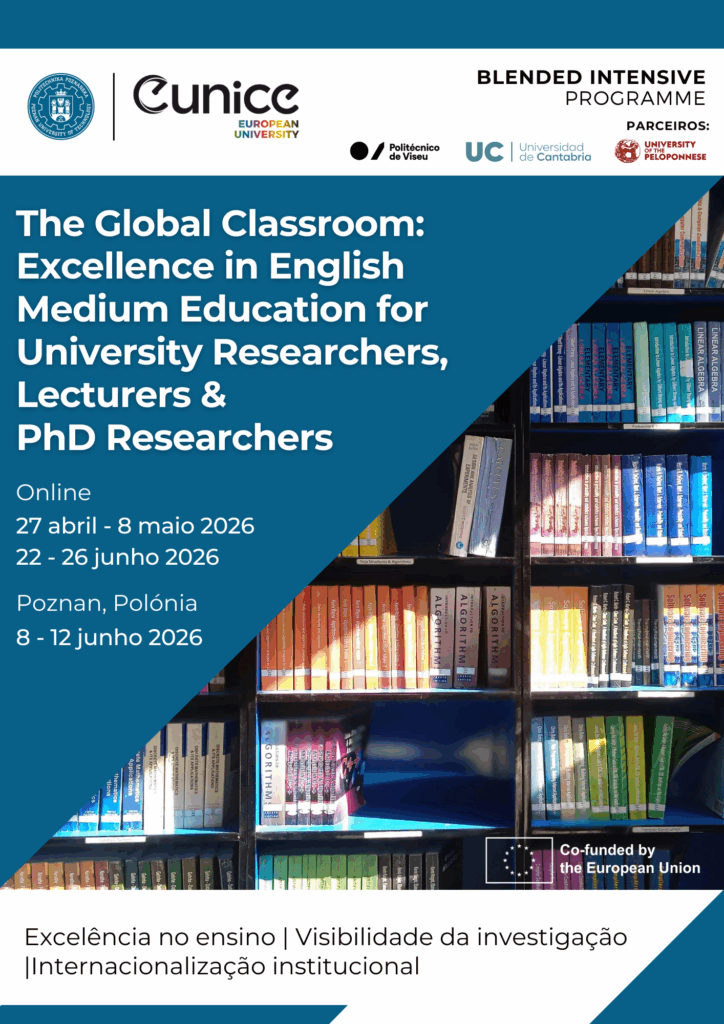 Destinatários: Staff das IES da Rede EUNICE Datas da Componente Virtual: Entre Dezembro 2024 e fevereiro 2025 Datas da Componente Física: 03 a 07 de fevereiro 2025 Creditação: 3 ECTS