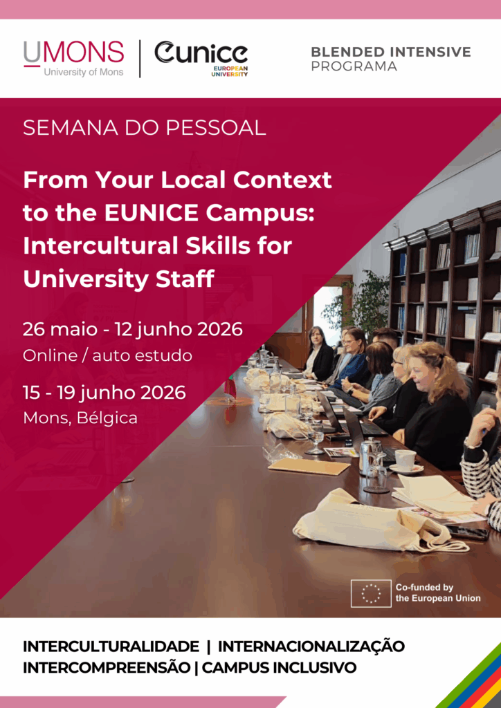 Perfil de admissão: Membros do pessoal administrativo e académico do IPV Datas da Componente Virtual: de 26 de maio a 12 de junho 2026 Datas da Componente Física: de 15 a 19 de junho 2026 Local: Mons, Bélgica (Universidade de Mons) Creditação: 3 ECTS Inscrições: Online