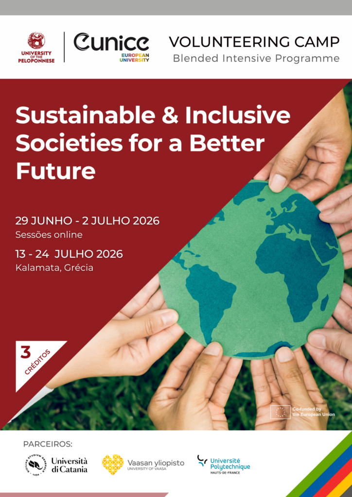 Datas da Componente Virtual: de 29 junho a 2 julho 2026 Datas da Componente Física: de 13 a 24 de julho de 2026 Local: Kalamata, Grécia (Universidade do Peloponeso) ECTS: 3 ECTS Inscrições: Online